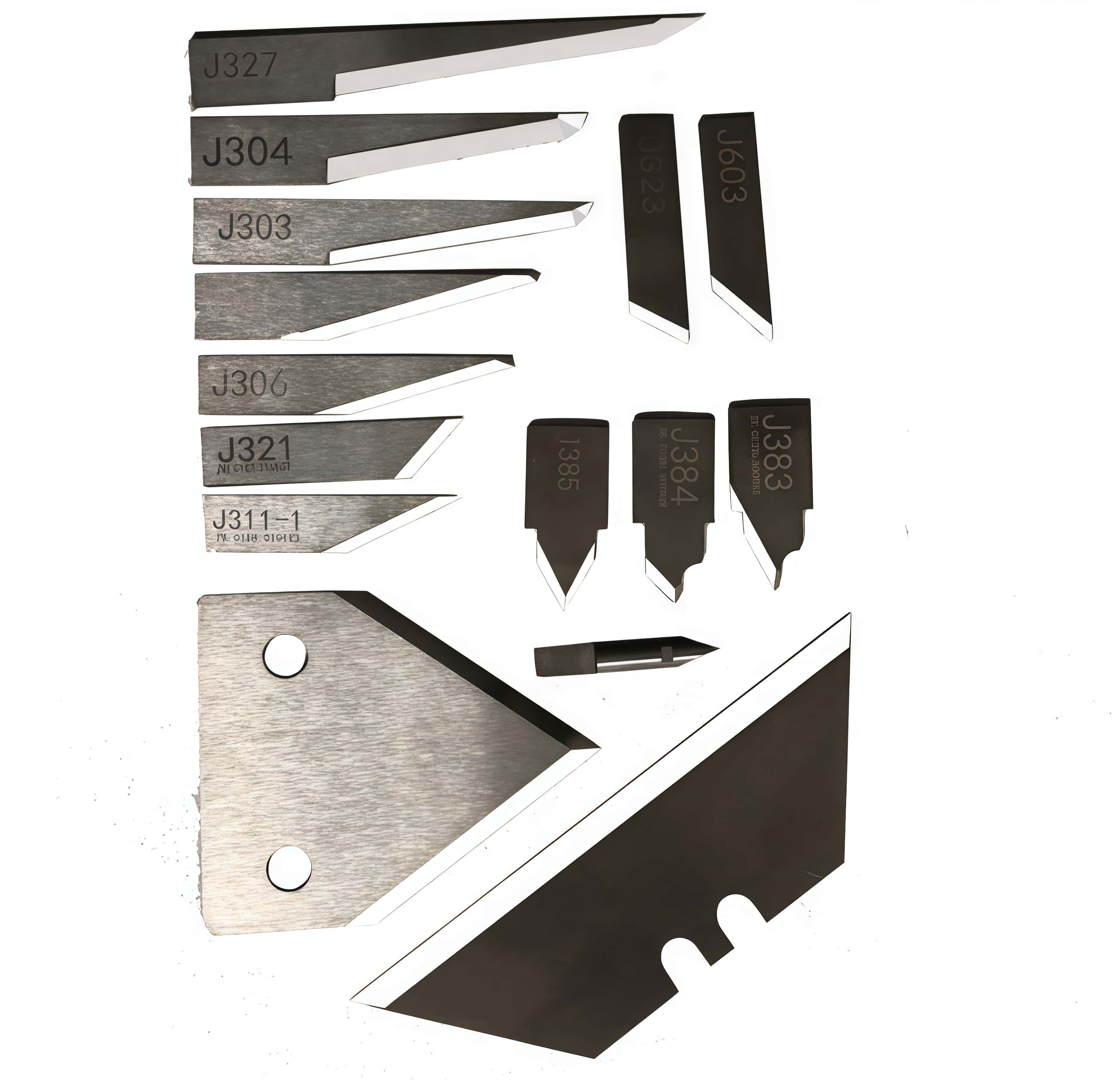 J303, J306‑T, J311‑1, J341, J356, J360, J374, J603, J660 and similar mid‑300/600 series numbers are rectangular oscillating or tangential knives for corrugated, solid board, foam, honeycomb, rubber, leather, and composites, differing mainly by length, thickness, and dual angles for cut depth and durability.